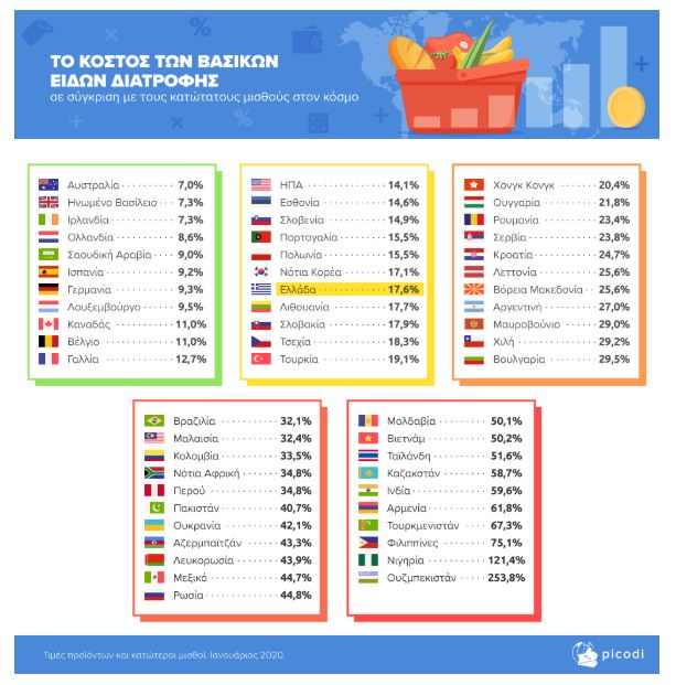 Η Ελλάδα κατέλαβε τη 18η θέση σε αυτή τη σύγκριση, ακολουθούμενη από τη Λιθουανία (17,7) και τη Σλοβακία (17,9). Οι κάτοικοι της Αυστραλίας, της Αγγλίας και της Ιρλανδίας ξοδεύουν τα λιγότερα στα βασικά προϊόντα διατροφής, 7% και 7,3% αντίστοιχα του κατώτατου μισθού.