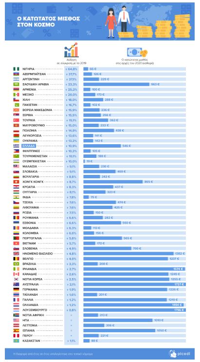 Η Ελλάδα βρίσκεται στην 16η θέση ανάμεσα στις 54 χώρες που περιλαμβάνονται στην έρευνα. Μεγαλύτερη αύξηση του ελάχιστου μισθού ετησίως παρατηρείται στη Νιγηρία (64,8%). Ωστόσο, όπως επισημαίνεται, μετά τη μετατροπή σε ευρώ, το ποσό αυτό εξακολουθεί να είναι από τα χαμηλότερα (66 ευρώ). Σε χώρες, όπως οι ΗΠΑ, η Ισπανία, η Νότια Αφρική ή η Λετονία, ο ελάχιστος μισθός δεν έχει αλλάξει.