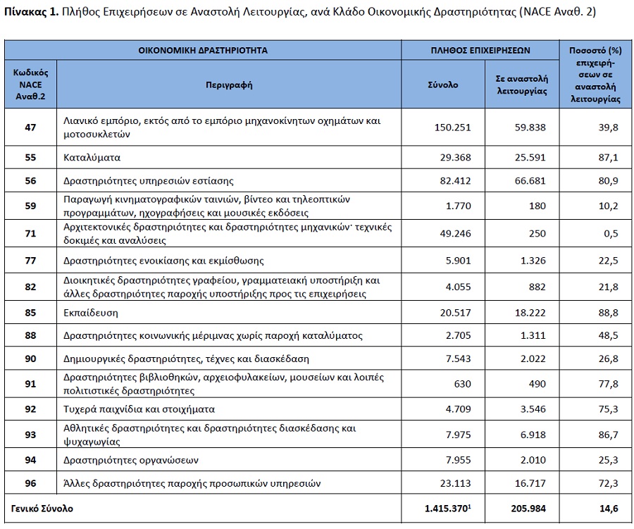 Από τις 205.984 επιχειρήσεις που τέθηκαν σε αναστολή λειτουργίας, οι επιχειρήσεις των κλάδων της Εκπαίδευσης και των Δραστηριοτήτων Οργανώσεων παρουσίασαν αύξηση στον κύκλο εργασιών κατά 0,6% και 3,1% αντίστοιχα μεταξύ πρώτου τριμήνου 2020 και πρώτου τριμήνου 2019, σύμφωνα με την Ελληνική Στατιστική Αρχή.