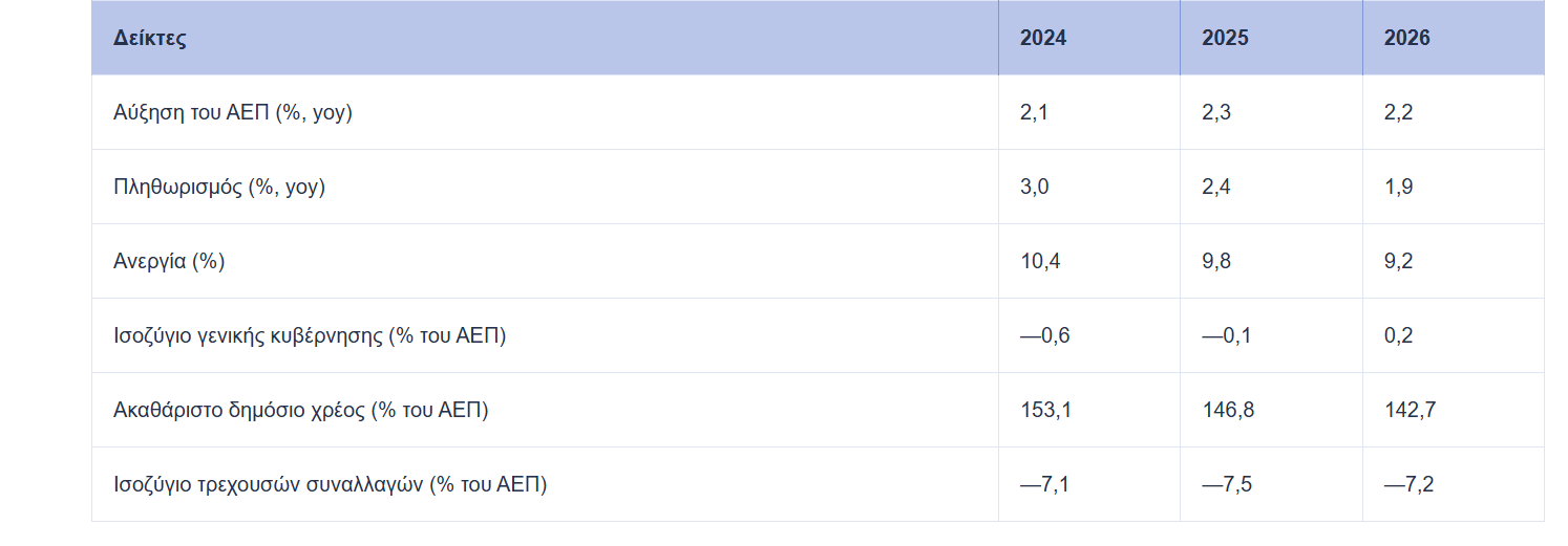 Για το 2025 προβλέπεται ανάπτυξη 2,3% (χωρίς μεταβολή σε σχέση με τις εαρινές προβλέψεις) και για το 2026 προβλέπεται ανάπτυξη 2,2%.