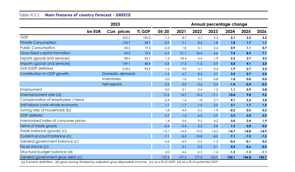 Ειδικότερα, η ΕΕ «βλέπει» πως η ανάπτυξη του ελληνικού ΑΕΠ θα κλείσει το 2024 στο 2,1%, σημαντικά πάνω από το μέσο όρο της Ευρωζώνης για ανάπτυξη 0,8%.