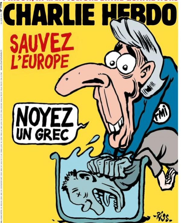 Σε φόντο κίτρινο, το προφίλ της Κριστίν Λαγκάρντ στο πρωτοσέλιδο του «Charlie Hebdo», δεν ξεγελάει κανέναν: Γκρίζο μαλλί, επιβλητική μύτη και θεληματικά μπράτσα, κρατούν σταθερά την κεφαλή κάποιου δυστυχή μέσα σε δοχείο νερού, ή γιατί όχι, κάποιου άλλου δηλητηριώδους υγρού.