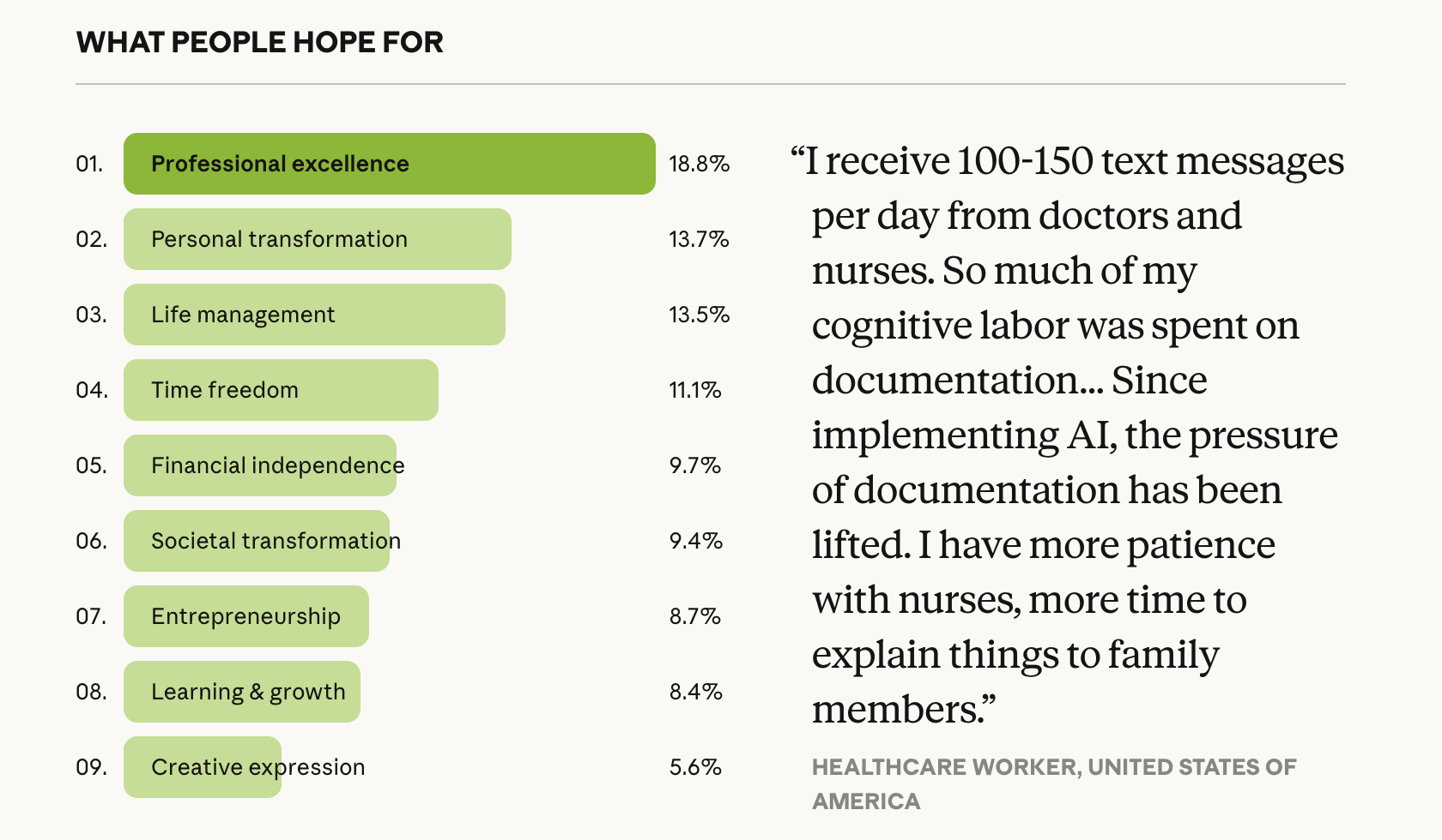 Οι βασικοί αριθμοί είναι ενδεικτικοί, αλλά όχι εκεί βρίσκεται η ουσία. Περίπου 19% των συμμετεχόντων ήθελαν την AI για “επαγγελματική αριστεία”, το μεγαλύτερο μεμονωμένο ποσοστό. Ένα ακόμη 14% αναζητούσε “προσωπική μεταμόρφωση” μέσω συναισθηματικής ανάπτυξης ή υποστήριξης υγείας. Περίπου 11% ήθελε περισσότερο χρόνο για οικογένεια και αναψυχή, ενώ σχεδόν 10% επιδίωκε οικονομική ανεξαρτησία.