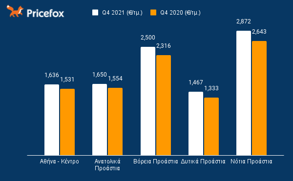 Νέα εποχή στα ακίνητα ορμώμενη από τα υβριδικά μοντέλα εργασίας και του νέου τρόπου ζωής μετά την πανδημία. Σε πολύ υψηλά επίπεδα κυμάνθηκαν οι τιμές των ακινήτων για το 2021, εκτροχιάζοντας επενδυτικές σκέψεις υποψήφιων αγοραστών αλλά και τους προϋπολογισμούς όσων νοικοκυριών βρίσκονται σε ενοίκιο ή όσων υπολόγιζαν να προχωρήσουν σε μίσθωση κατοικίας. Η ενεργειακή κρίση σε συνδυασμό με τον πληθωρισμό αυξάνει το οικοδομικό κόστος. Η έρευνα που πραγματοποίησε το Pricefox η ελληνική startup που προσφέρει online σύγκριση σε τιμές και καλύψεις για ασφάλεια αυτοκινήτου, παρουσιάζει την αύξηση στις τιμές των ακινήτων προς πώληση και ενοικίαση, σύμφωνα με τα στοιχεία από το δίκτυο ηλεκτρονικών αγγελιών Spitogatos.