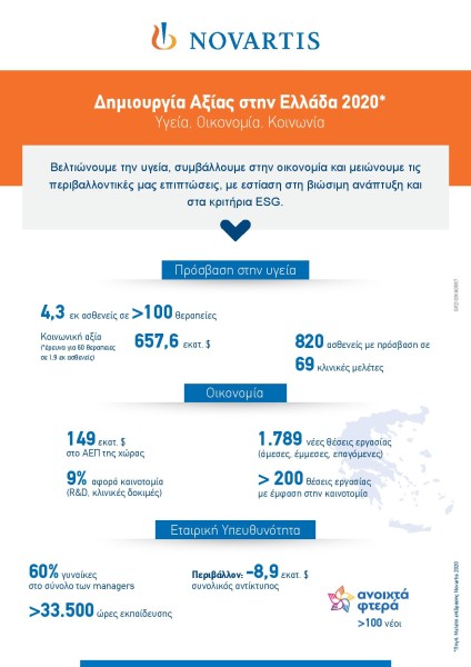 Η Novartis Hellas συνεισέφερε $149 εκ. στο ΑΕΠ της χώρας το 2020, ενώ παράλληλα δημιούργησε περίπου 1.789 άμεσες, έμμεσες και επαγόμενες θέσεις εργασίας. 200 από τις θέσεις αυτές, ποσοστό που φθάνει το 11%, σχετίζονται με την καινοτομία. Η Novartis επενδύει σταθερά στην εγχώρια οικονομία, και τα αποτελέσματα επιβεβαιώνουν τη δέσμευσή της απέναντι στους ασθενείς και την ελληνική κοινωνία.