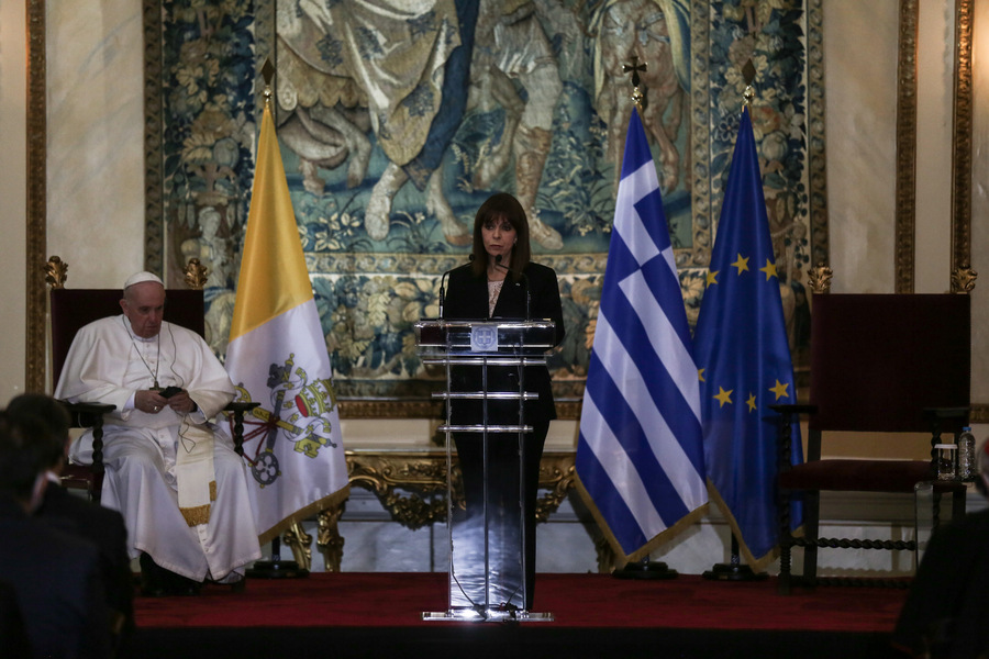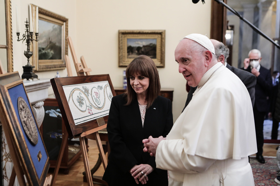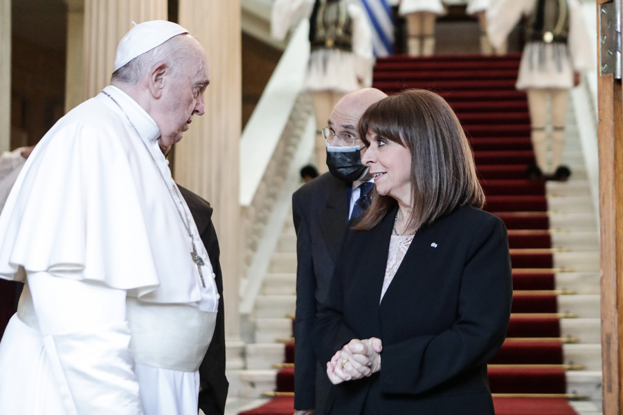 Με κάθε επισημότητα και ιδιαίτερη συγκίνηση η Πρόεδρος της Δημοκρατίας Κατερίνα Σακελλαροπούλου υποδέχθηκε στο Προεδρικό Μέγαρο τον Πάπα Φραγκίσκο, υπογραμμίζοντας ότι η επίσκεψή του, για δεύτερη φορά στη χώρα μας, υποδηλώνει το υψηλό ενδιαφέρον του για την περιοχή και την ευρύτερη Μεσόγειο, καθώς και τη διαρκή μέριμνά του για τον θρησκευτικό διάλογο και την οικουμενικότητα της χριστιανοσύνης.