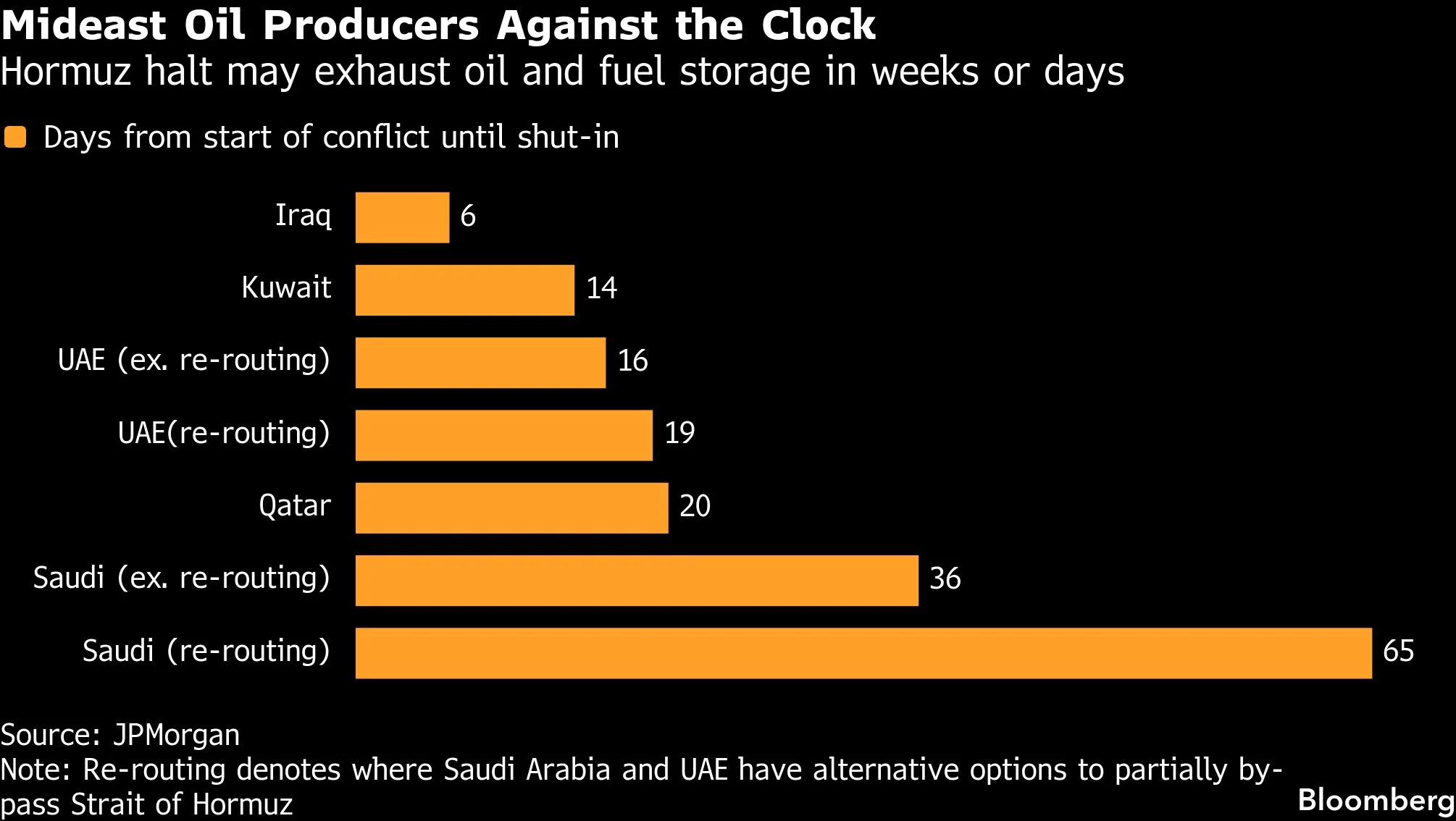 Η μείωση της παραγωγής από το Κουβέιτ ξεκίνησε με περίπου 100.000 βαρέλια την ημέρα και αναμένεται να τριπλασιαστεί, με περαιτέρω σταδιακές μειώσεις ανάλογα με τα επίπεδα αποθήκευσης και την κατάσταση του Ορμούζ. Τα ΗΑΕ, που παράγουν πάνω από 3,5 εκατομμύρια βαρέλια την ημέρα, χρησιμοποιούν εναλλακτικές οδούς για εξαγωγή πετρελαίου, όπως ο αγωγός 1,5 εκατ. βαρελιών/ημέρα προς τη Φουτζέιρα, παρακάμπτοντας τα Στενά.