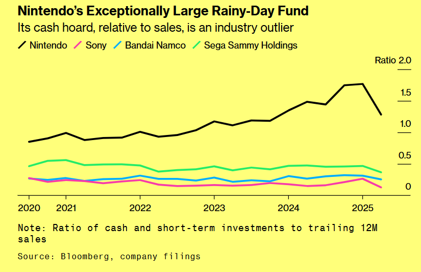 Το απόθεμα μετρητών της Nintendo, που ανέρχεται πλέον σε περίπου 1,5 τρισεκατομμύρια γεν και περίπου 120% των πωλήσεων, την βοήθησε να ξεπεράσει τα δύσκολα χρόνια που ακολούθησαν τις εμπορικές αποτυχίες όπως το GameCube και το Wii U. Παράλληλα, παρείχε ένα δίχτυ ασφαλείας για τους δημιουργούς ώστε να αναλάβουν μακροπρόθεσμα έργα.