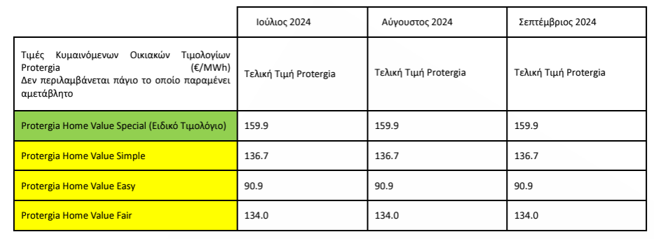 Στον παρακάτω συγκριτικό πίνακα παρατίθενται οι τιμές της Protergia για τον μήνα Σεπτέμβριο για τους οικιακούς καταναλωτές, σε σύγκριση με τους μήνες Ιούλιο και Αύγουστο: