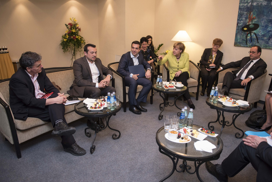 Περίπου 2,5 ώρες διήρκεσε η συνάντηση του Αλέξη Τσίπρα με την Γερμανίδα καγκελάριο Άνγκελα Μέρκελ και τον πρόεδρο της Γαλλίας Φρανσουά Ολάντ. Στη συνάντηση συμμετείχαν από ελληνικής πλευράς ο υπουργός Επικρατείας Νίκος Παππάς και ο αναπληρωτής υπουργός Διεθνών Οικονομικών Σχέσεων Ευκλείδης Τσακαλώτος.