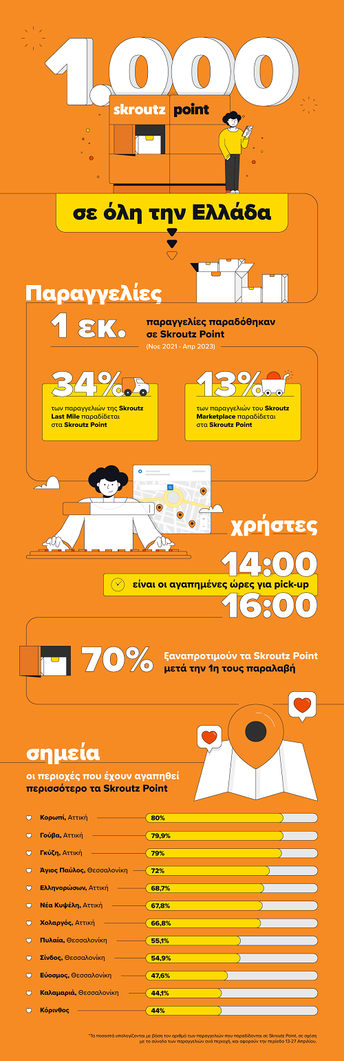 1 εκατομμύριο παραγγελίες σχεδόν, έχουν εξυπηρετήσει τα Skroutz Point μέσω Skroutz Last Mile μεταφορικής, μέσα στον ενάμιση χρόνο λειτουργίας τους.