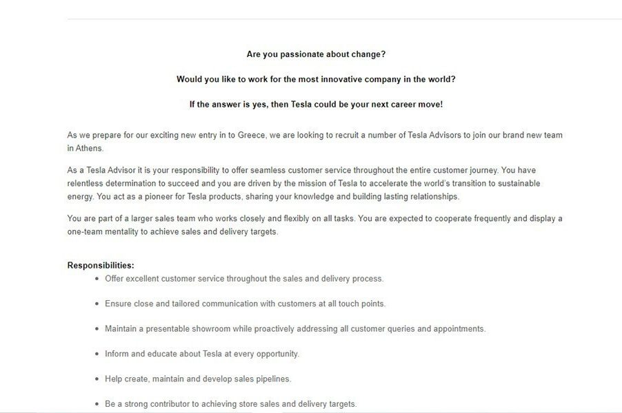 Όπως μπορούμε λοιπόν να δούμε λοιπόν και πάλι στο επίσημο site της εταιρείας, η Tesla αναφέρει ξεκάθαρα ότι προετοιμάζεται για την «συναρπαστική» νέα είσοδό της στην Ελλάδα, εξ ου άλλωστε και βρίσκεται σε αναζήτηση συνεργατών σε 2 τμήματα, έναν στο κομμάτι της Διεύθυνσης Πωλήσεων και Παράδοσης Αυτοκινήτων, καθώς και μια σειρά από νέους «Σύμβουλους Tesla» (Tesla Advisor) που θα αναλάβουν το customer support.