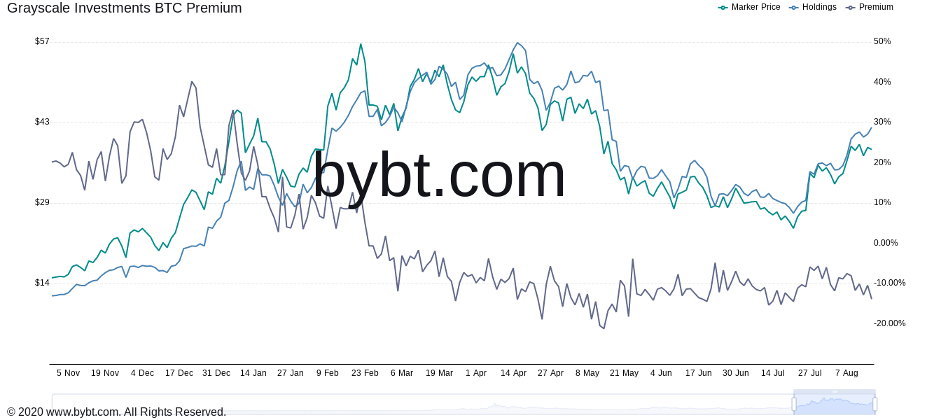 Παρόλο που το Bitcoin έχει αυξηθεί στην τιμή, η ζήτηση GBTC δεν έχει αυξηθεί. Σημειώνεται ότι κατά τη ραγδαία πτώση στις τιμές του BTC, το premium GBTC ήταν περίπου -20%.
