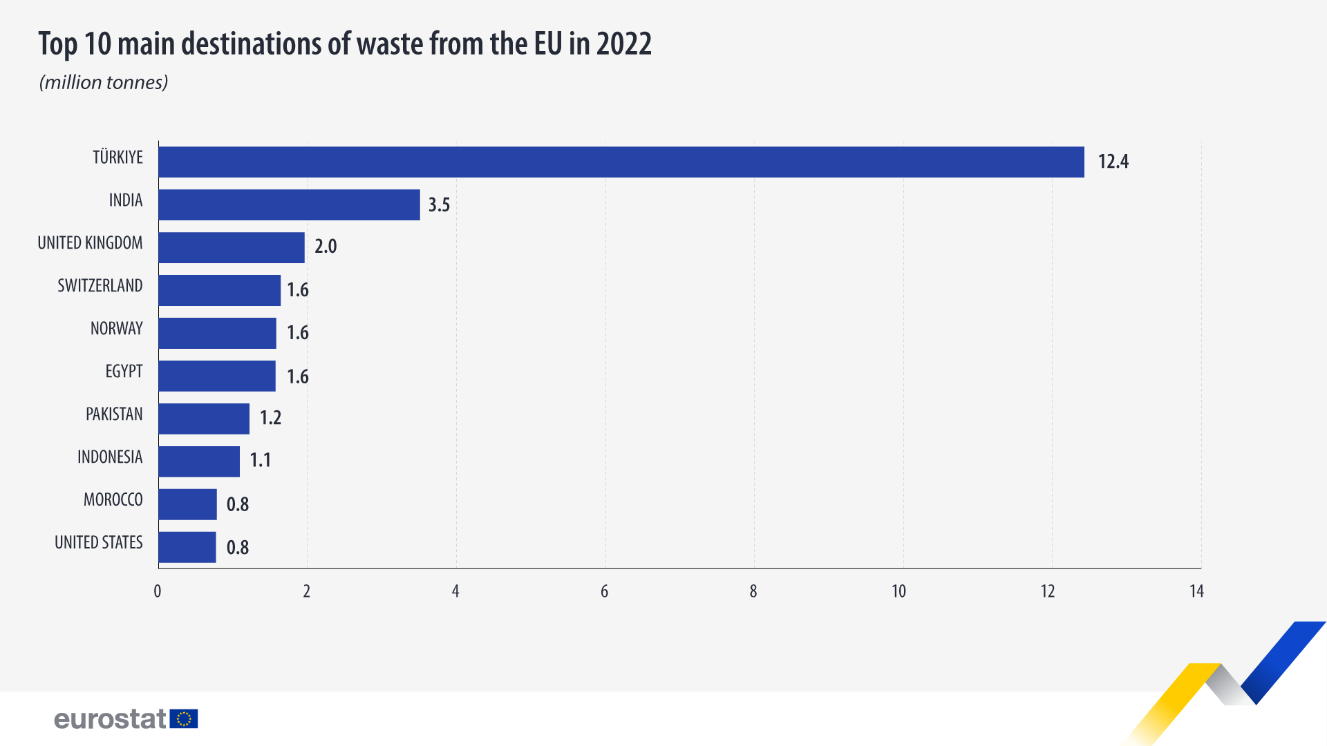 Η Τουρκία ήταν ο μεγαλύτερος προορισμός για τα απόβλητα που εξήχθησαν από την ΕΕ το 2022. Με όγκο 12,4 εκατομμυρίων τόνων, αντιστοιχούσε στο 39% των συνολικών εξαγωγών αποβλήτων.