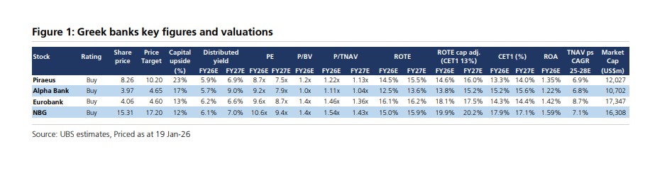 Σε αυτό το πλαίσιο, η UBS διατηρεί σύσταση «Buy» και για τις τέσσερις τράπεζες, προβλέποντας σημαντικές μερισματικές αποδόσεις FY27E, με την Alpha Bank να ηγείται στο 9,0%, ακολουθούμενη από την Πειραιώς (6,9%) και την Εθνική (7,0%).