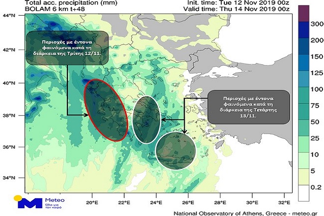Από τις μεσημεριανές ώρες της Τρίτης, αρχικά στο Ιόνιο και στη συνέχεια στα υπόλοιπα δυτικά τμήματα, αναμένονται βροχές και καταιγίδες, οι οποίες κατά τη διάρκεια των βραδινών και νυκτερινών ωρών θα κινηθούν ανατολικά και θα επηρεάσουν τα υπόλοιπα ηπειρωτικά τμήματα και τη Δυτική Κρήτη. Τα φαινόμενα θα είναι κατά τόπους ισχυρά, ενώ τοπικές χαλαζοπτώσεις αναμένονται στα νότια τμήματα.
