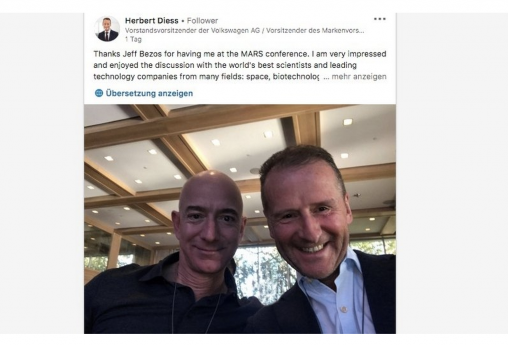 Αυτή την εβδομάδα, ο Diess δημοσίευσε μια selfie με τον CEO της Amazon, Jeff Bezos, από το συνέδριο MARS στο Palm Springs, γράφοντας «ανυπομονώ να διαμορφώσω το μέλλον μαζί του».