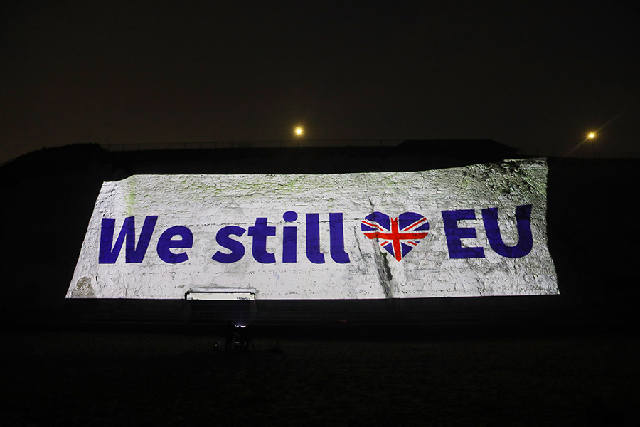 Στους λευκούς βράχους του Ντόβερ προβαλλόταν το μήνυμα: «Το Ηνωμένο Βασίλειο αποχώρησε από την ΕΕ» ανάμεσα σε μία βρετανική και μία ευρωπαϊκή σημαία.