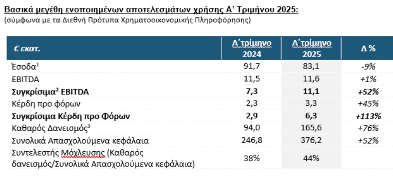 1Δεν περιλαμβάνονται τα έσοδα της Μπάρμπα Στάθης ύψους € 32,1 εκατ. το Α τρίμηνο 2025 (ενοποίηση στα μεγέθη Δ.Π.Χ.Α. από ημερομηνία εξαγοράς, 31.03.2025), ενώ το αποτέλεσμα του περιλαμβάνεται στα συγκρίσιμα από 1/1/2025.
