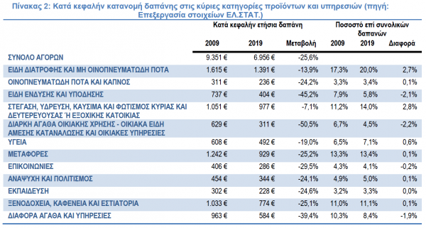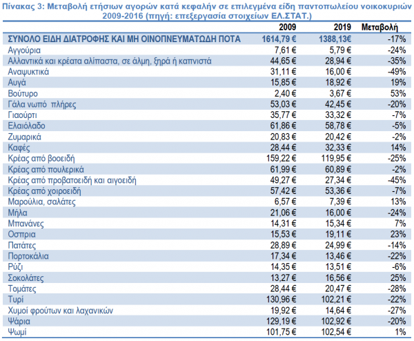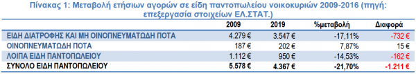 Το 2009 το μέσο νοικοκυριό δαπανούσε μηνιαία σε είδη παντοπωλείου 5.578 ευρώ ενώ το 2019 4.367 ευρώ, δηλαδή 1.211 ευρώ λιγότερα ανά έτος. Ωστόσο, την τελευταία τετραετία (2016-2019) η δαπάνη των νοικοκυριών σε τρόφιμα παρουσιάζει αύξηση από 1.337 ευρώ κατά κεφαλήν το 2016 σε 1.388 το 2019, μεταβολή 3,83%, η οποία αν και δεν μπορεί να αντισταθμίσει τις μειώσεις των προηγούμενων ετών, εμφανίζεται σε ένα περιβάλλον σταθερών τιμών, καθώς ο δείκτης τιμών καταναλωτή από το 2016 ως το 2019, παρέμεινε πρακτικά αμετάβλητος με αύξηση μόλις 0,61% σε βάθος τετραετίας.