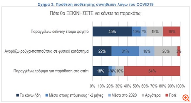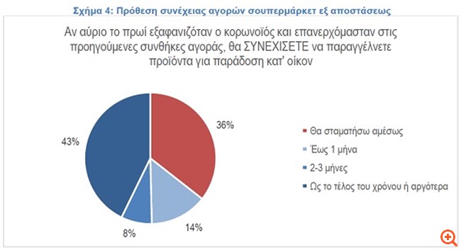 Παράλληλα στο υποθετικό ερώτημα για το τι θα έκαναν οι καταναλωτές εφόσον εξαφανιζόταν η κρίση του κορωνοϊού σε σχέση με τις εξ αποστάσεως αγορές προϊόντων σουπερμάρκετ το 50% θα σταματήσει αμέσως ή σχεδόν αμέσως (έως 1 μήνα) τις αγορές εξ αποστάσεως, το 8% λίγο αργότερα, αλλά το 43% θα διατηρήσει αυτή τη συνήθεια τουλάχιστον ως το τέλος του χρόνου ή αργότερα. Το στοιχείο αυτό δείχνει ότι η νέα βάση του αγοραστικού κοινού για τις διαδικτυακές αγορές τροφίμων είναι περίπου 6-7%.