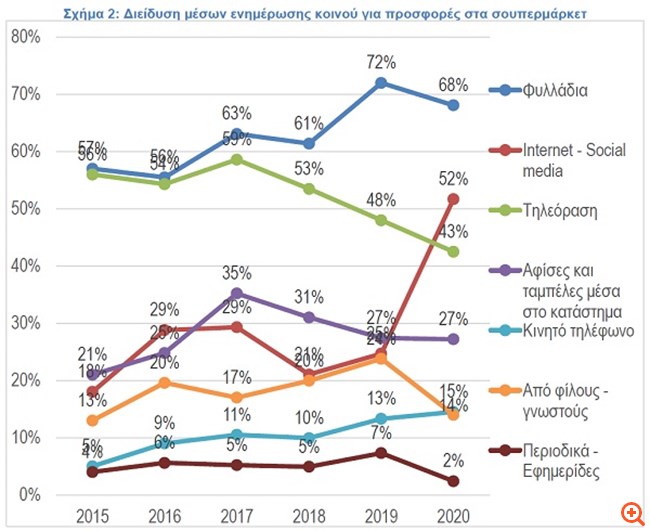 Χαρακτηριστική για την απότομη διείσδυση του διαδικτύου στην καθημερινότητα των καταναλωτών είναι ότι εκτός των ηλεκτρονικών αγορών, το συγκεκριμένο κανάλι χρησιμοποιείται όλο και περισσότερο για την ενημέρωση των καταναλωτών. Συγκεκριμένα σε σχέση με τον Δεκέμβριο του 2019 καταγράφεται μία απότομη αύξηση στην επιλογή του διαδικτύου για την ενημέρωση για τις προσφορές και εκπτώσεις των σουπερμάρκετ από το 25% στο 52% και του κινητού (εφαρμογές) από το 13% στο 15%. Όλα τα υπόλοιπα κανάλια παρουσιάζουν μείωση. Το φυλλάδιο του σουπερμάρκετ από 72% σε 68%, η τηλεόραση από 48% σε 43%, οι αφίσες στο 27% χωρίς μεταβολή, και η ενημέρωση από φίλους γνωστούς λόγω και του social distancing από το 24% στο 14%.