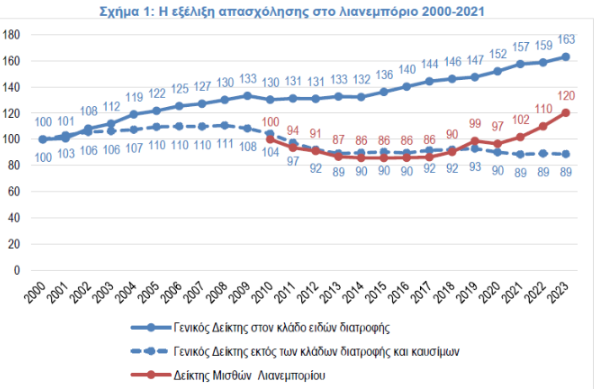 Συγκεκριμένα από την επεξεργασία των στοιχείων απασχόλησης που παρέχει σε τριμηνιαία βάση η ΕΛ.ΣΤΑΤ. προκύπτει ότι την περίοδο 2000-2023 το λιανεμπόριο τροφίμων παρουσιάζει αύξηση της απασχόλησης κατά 63%, σε αντίθεση με το υπόλοιπο λιανικό εμπόριο το οποίο παρουσιάζει μείωση κατά 11%. Πρακτικά το λιανεμπόριο τροφίμων το 2023 απασχολεί πάνω από 80 χιλ. περισσότερους εργαζόμενους σε σχέση με το 2000 ξεπερνώντας τις 222 χιλ. άμεσα απασχολούμενους.