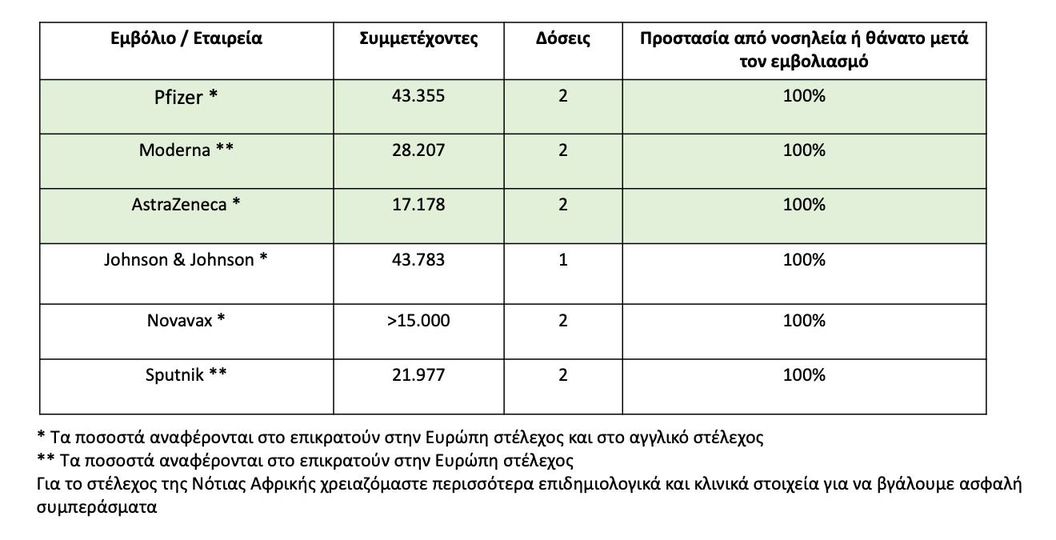 Έξι εμβόλια είναι κατά 100% αποτελεσματικά, όσον αφορά την προστασία που παρέχουν από νοσηλεία ή θάνατο, εάν μετά τον εμβολιασμό κάποιος κολλήσει κορωνοϊό, είτε το επικρατούν στέλεχος στην Ευρώπη είτε την παραλλαγή που κυκλοφορεί κυρίως στην Αγγλία.