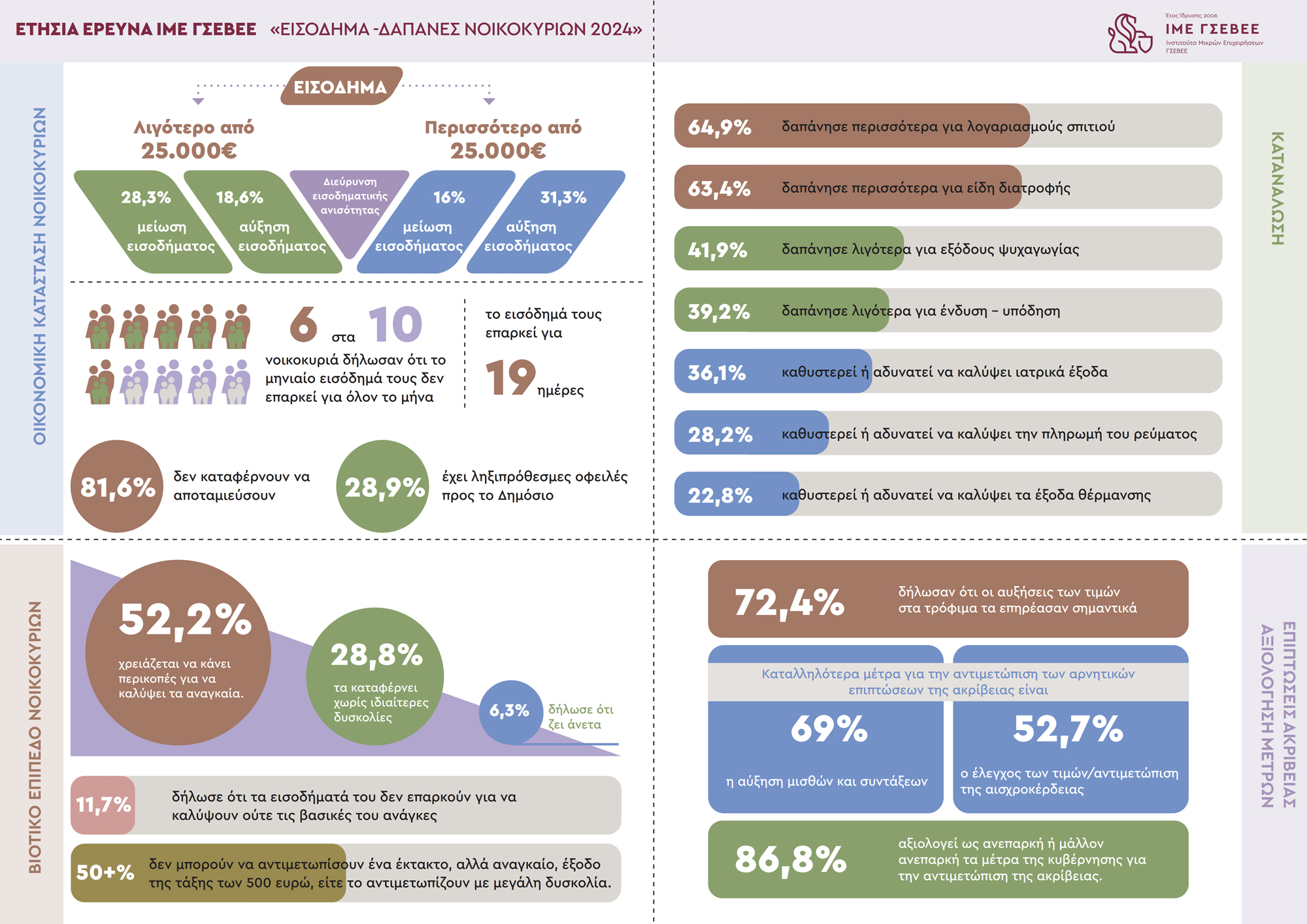 Η οικονομική πίεση παραμένει έντονη στην κοινωνία, με το 60% των νοικοκυριών να δηλώνει ότι το εισόδημά του δεν επαρκεί για όλον τον μήνα και το 81,6% να αδυνατεί να αποταμιεύσει. Επιπλέον, το 11,7% ζει σε συνθήκες ακραίας φτώχειας.