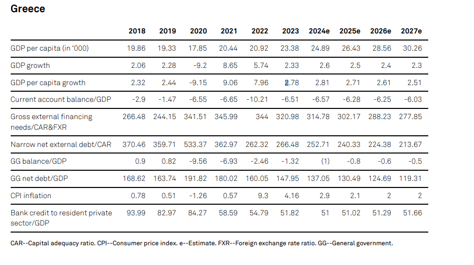 Ειδικότερα, ο οίκος προβλέπει για την ελληνική οικονομία ανάπτυξη 2,5% το 2025, 2,4% το 2026 και 2,3% το 2027, διατηρώντας παράλληλα θετικές προοπτικές για την πιστοληπτική αξιολόγηση BBB- και, παράλληλα, υπογραμμίζοντας ότι θα μπορούσε να αναβαθμίσει την αξιολόγηση της χώρας εάν το χρέος της μειωθεί περαιτέρω.