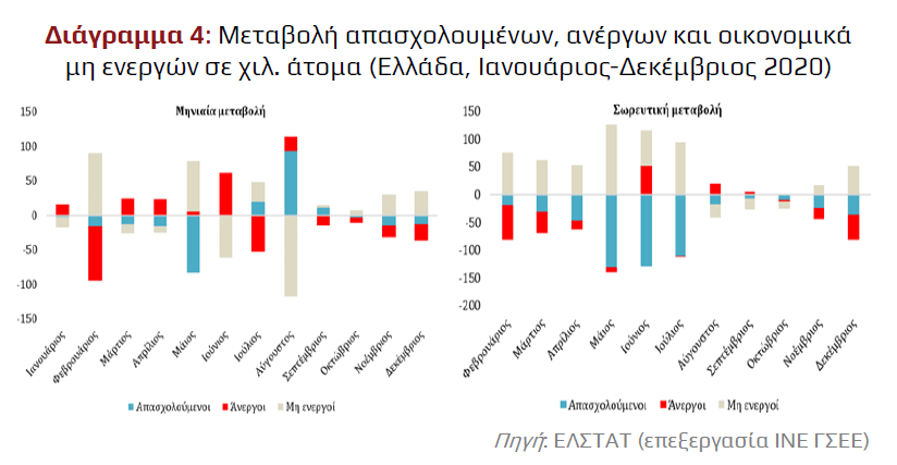 Δεν είναι ξεκάθαρο αν η δυναμική που παρατηρείται στο τέλος του 2020 θα συνεχιστεί, αλλά σε αυτό το διάστημα είναι η πρώτη φορά μετά το ξέσπασμα της πανδημικής κρίσης που η μεταβολή των οικονομικά μη ενεργών προέρχεται και από τη μείωση των ανέργων.