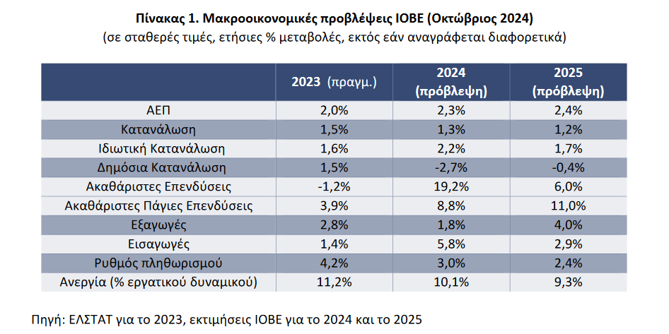 Σύμφωνα με την έκθεση, πορεία όμοια με εκείνη του 2023, δηλαδή ετήσια ανάπτυξη του ελληνικού ΑΕΠ στο 2,3% βλέπει το Ίδρυμα, με ώθηση από την ενίσχυση των επενδύσεων.