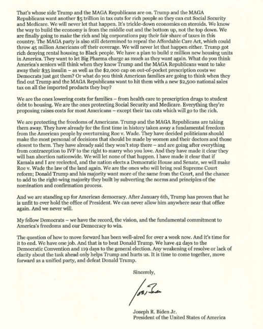 Στη σημερινή του επιστολή, ο κ. Μπάιντεν γράφει ότι είχε «εκτενείς συζητήσεις» με την ηγεσία του Δημοκρατικού Κόμματος και «κυρίως με τους ψηφοφόρους των Δημοκρατικών» τις τελευταίες 10 ημέρες.