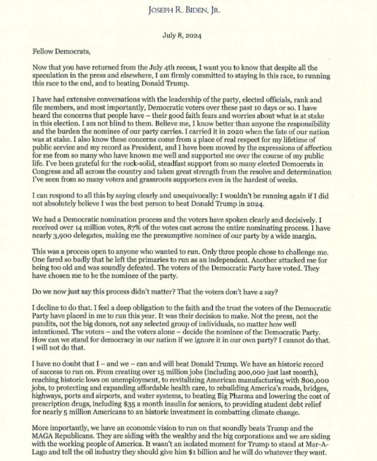 Σε επιστολή του προς τους Δημοκρατικούς του Κογκρέσου, ο Μπάιντεν υποστηρίζει πως είναι «σταθερά προσηλωμένος» στην εκστρατεία επανεκλογής του και ορκίστηκε να παραμείνει στην αναμέτρηση με τον Ντόναλντ Τραμπ.