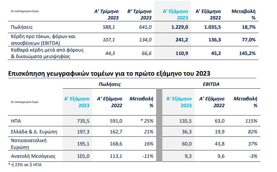 Τα κέρδη προ τόκων, φόρων και αποσβέσεων (EBITDA) αυξήθηκαν στα €241,2 εκ., συγκριτικά με €136,3 εκ. το πρώτο εξάμηνο του 2022, καταγράφοντας αύξηση ύψους 77% καιτα περιθώρια κερδοφορίας αυξήθηκαν, καθώς οι επενδύσεις που υλοποιήθηκαν τα τελευταία δύο χρόνια βελτιώνουν σταδιακά στοιχεία του κόστους.