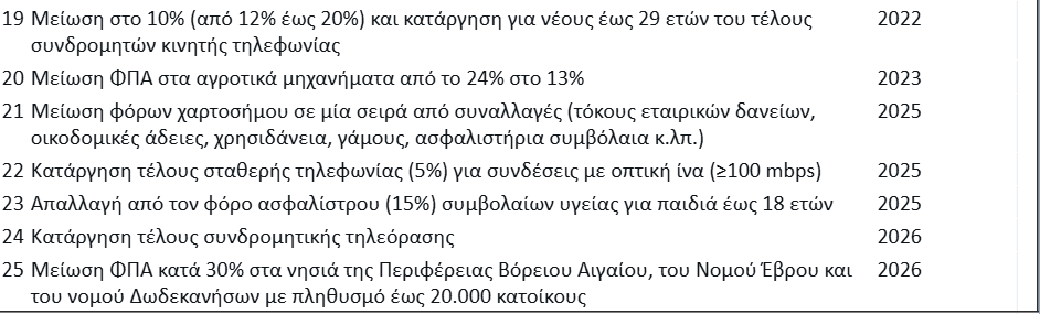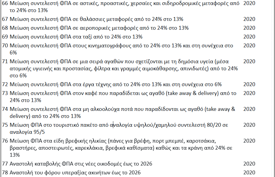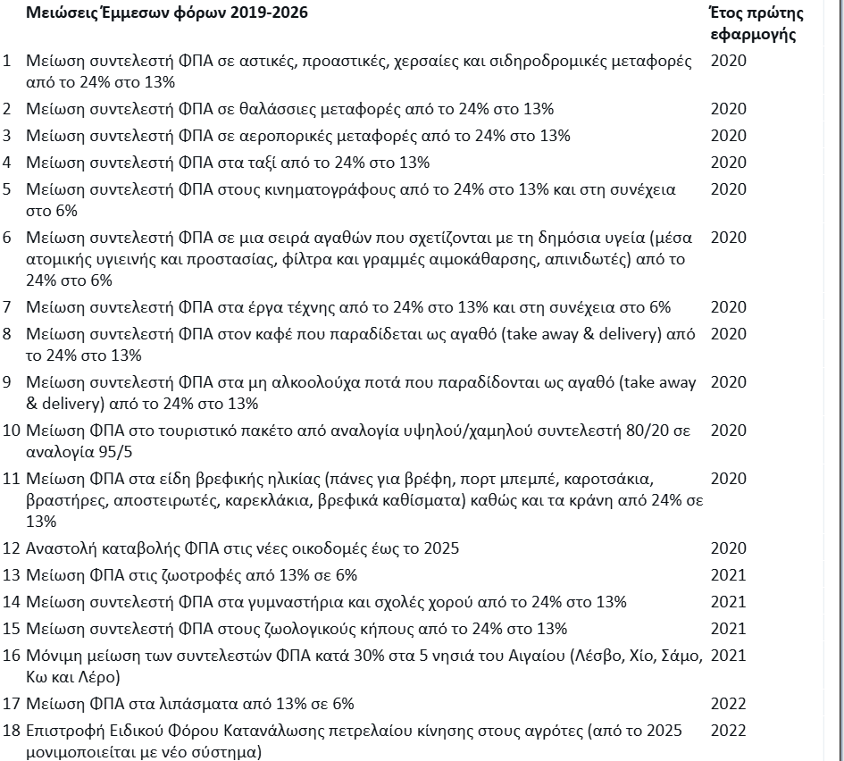 Από τις 83 μειώσεις φόρων και εισφορών, οι 25 αφορούν σε έμμεση φορολογία. Ανάμεσά τους είναι η μείωση του συντελεστή ΦΠΑ στις αστικές, προαστιακές και χερσαίες σιδηροδρομικές μεταφορές (στο 13% από 24%), η μείωση του ΦΠΑ στα είδη βρεφικής ηλικίας (13% από 24%) και η αναστολή καταβολής ΦΠΑ στις νέες οικοδομές.