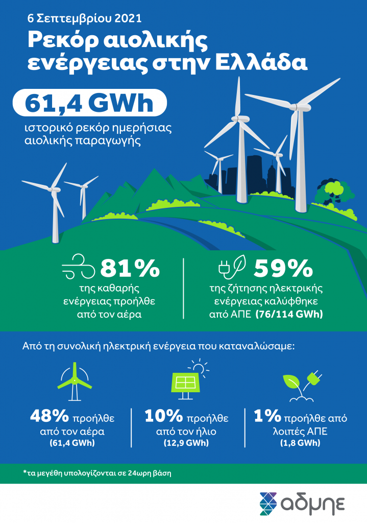 Σύμφωνα με τα επίσημα στοιχεία του ΑΔΜΗΕ, προχθές Δευτέρα σημειώθηκε ιστορικό ρεκόρ ημερήσιας αιολικής παραγωγής, η οποία έφθασε στις 61,4 γιγαβατώρες, μέγεθος που αντιστοιχεί περίπου στη μισή ζήτηση (48%) της ημέρας. Συνολικά οι ανανεώσιμες πηγές κάλυψαν το 59% της ημερήσιας ζήτησης (48% αιολικά, 10% φωτοβολταϊκά, 1% λοιπές ΑΠΕ).