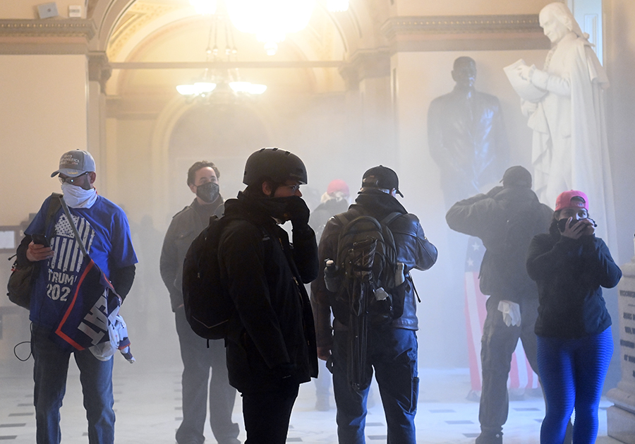 Supporters of US President Donald Trump enter the US Capitol as tear gas fills the corridor on January 6, 2021, in Washington, DC. - Demonstrators breeched security and entered the Capitol as Congress debated the a 2020 presidential election Electoral Vote Certification. (Photo by Saul LOEB / AFP) Photo: AFP