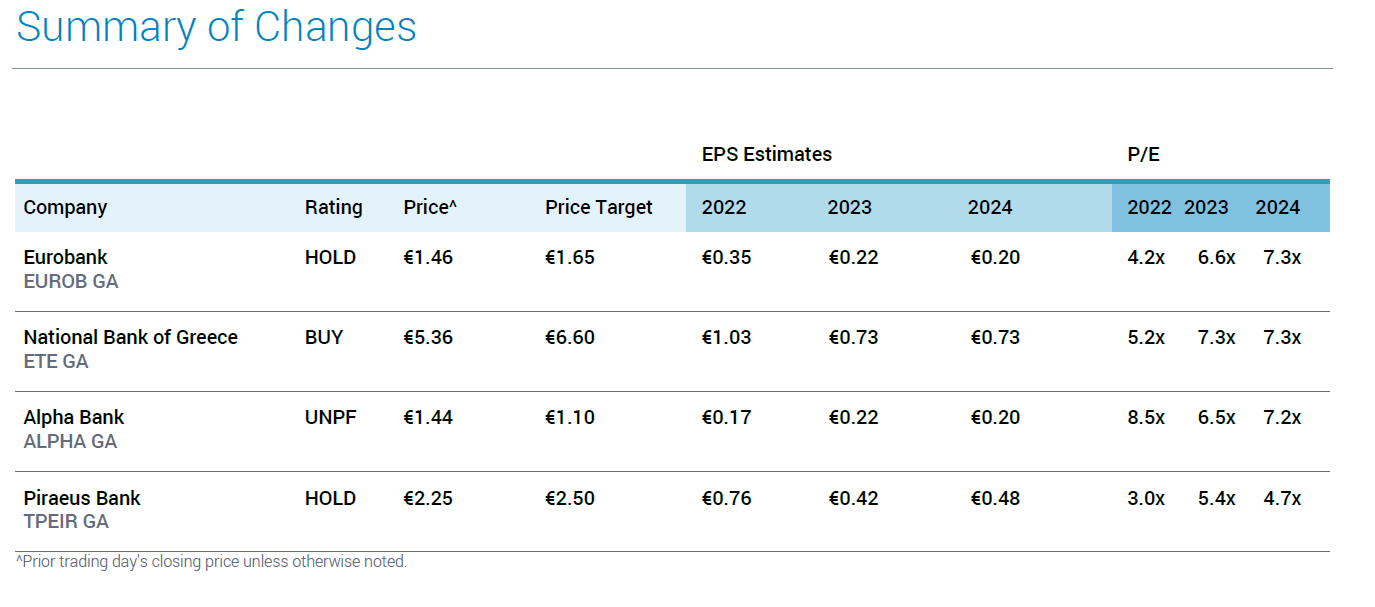 Ειδικότερα, σε ό,τι αφορά τα NII, δεδομένου ότι περίπου το 90% των χαρτοφυλακίων δανείων των ελληνικών τραπεζών έχουν κυμαινόμενο επιτόκιο, οι εκτιμήσεις της αγοράς φαίνονται υπερβολικά συντηρητικές, εκτιμώντας μόλις 15% αύξηση στα έσοδα από τόκους το 2023, έναντι περίπου 25% για Ιταλία/Ισπανία – («βρισκόμαστε κατά 10% πάνω από τη συναίνεση στο 2023»).