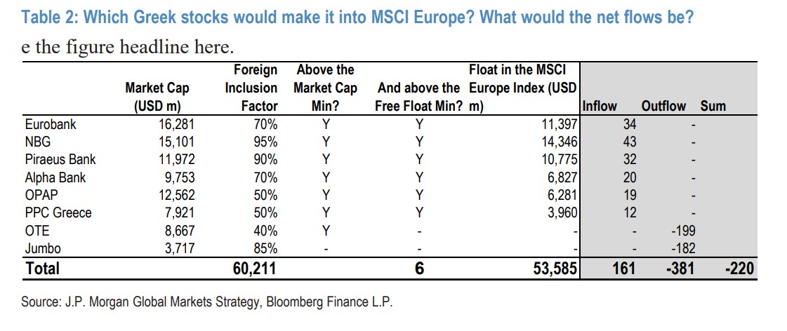 «Εκτιμούμε καθαρές εκροές 220 εκατ. δολαρίων, με εισροές 161 εκατ. από τις 6 μετοχές που μετακινούνται στις DM έναντι εκροών 381 εκατ» αναφέρει η JP Morgan και συμπληρώνει: «Η υποβάθμιση της σημασίας της αγοράς από πάνω από 4% στον MSCI EMEA EM σε κάτω από 30 μονάδες βάσης στον MSCI Europe / 5 μονάδες βάσης στον MSCI World είναι πιθανό να μειώσει τον αριθμό των επενδυτών που παρακολουθούν την αγορά».
