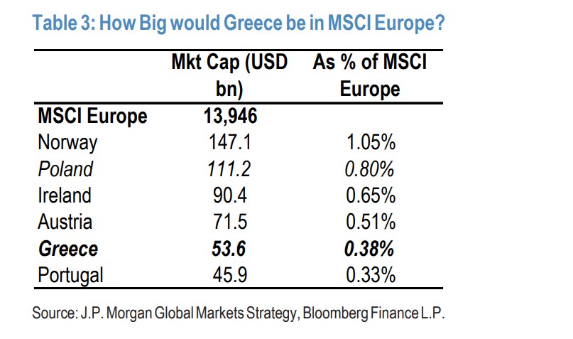 Η στάθμιση της Ελλάδας θα είναι 38 μονάδες βάσης στον MSCI Europe, μικρότερη από της Αυστρίας (51 μ.β.) και της Ιρλανδίας (65 μ.β.), αλλά μεγαλύτερη από της Πορτογαλίας (33 μ.β.).