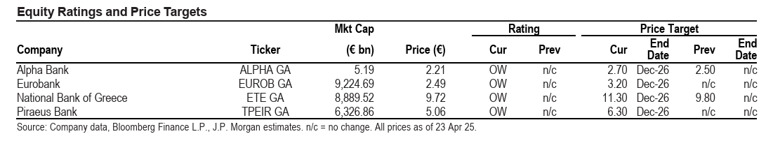 Σε σχέση με τη Eurobank η JP Morgan «βλέπει» αύξηση των κερδών ανά μετοχή κατά +4%/+1%/+3% για τα έτη 2025/2026/2027. Επίσης, «παρά την αρνητική προοπτική για τα επιτόκια, θεωρεί ότι η Eurobank μπορεί να διατηρήσει κανονικοποιημένη απόδοση ιδίων κεφαλαίων (ROTE) 15% το 2027. Σε αυτό το πλαίσιο, η τιμή-στόχος για τον Δεκέμβριο του 2026 παραμένει αμετάβλητη στα 3,20 ευρώ.