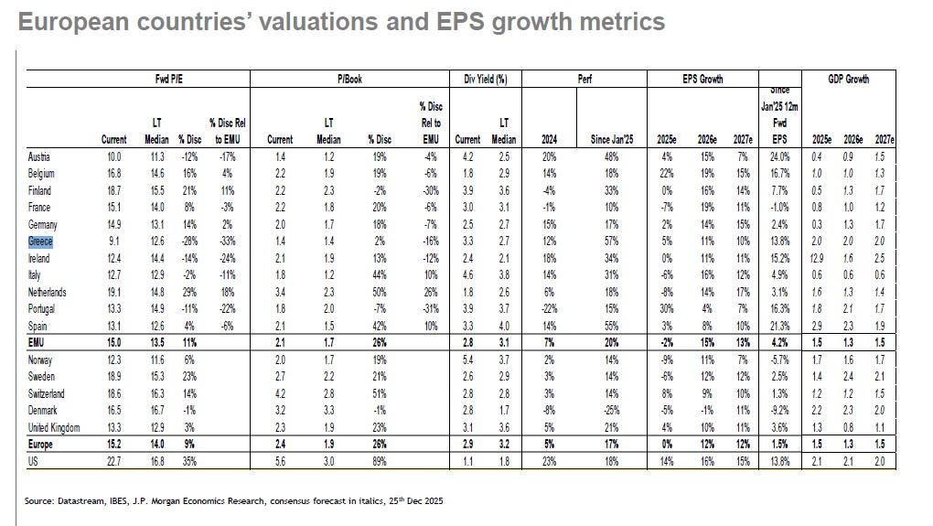 Ειδικότερα, σύμφωνα με τα στοιχεία της JP Morgan, η Ελλάδα παραμένει μία από τις πιο «φθηνές» αγορές στην Ευρώπη. Ο δείκτης Fwd P/E διαμορφώνεται στο 9,1, σημαντικά χαμηλότερα από τον ιστορικό μέσο όρο της χώρας (-28%) και κατά 33% χαμηλότερα από τον μέσο όρο της Ευρωζώνης.