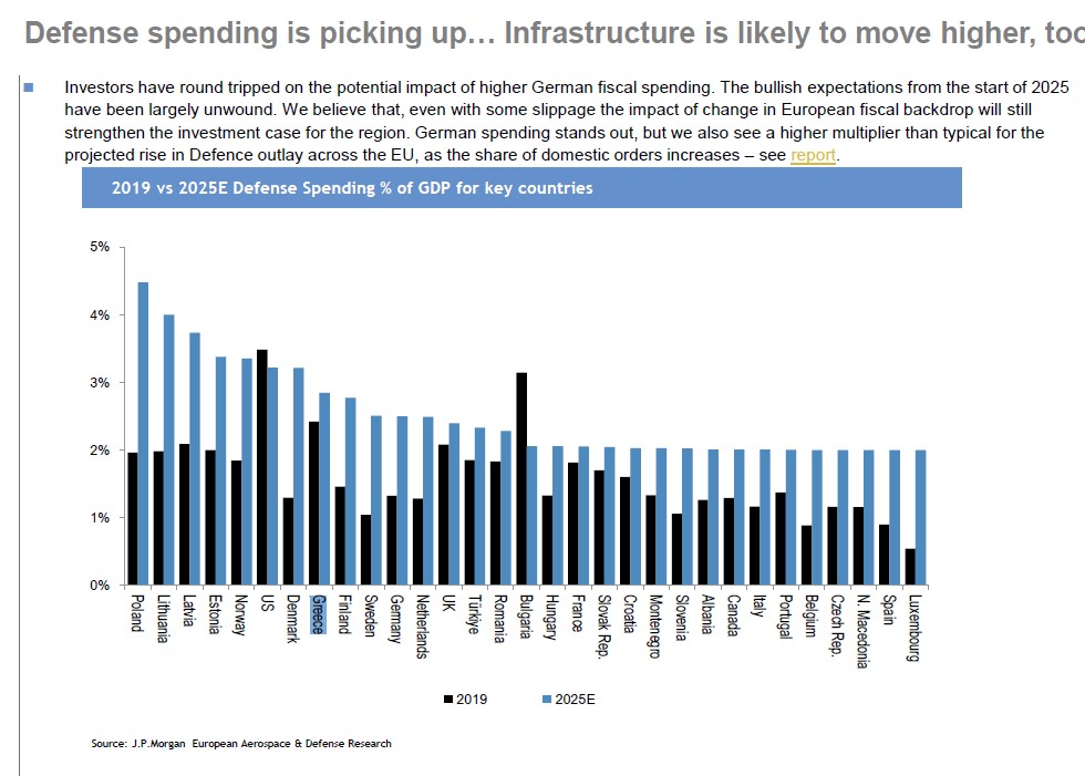 Το 2025, οι αμυντικές δαπάνες της Ελλάδας εκτιμάται ότι θα αγγίξουν το 2,9% του ΑΕΠ, κατατάσσοντας τη χώρα στην 8η θέση μεταξύ των ευρωπαϊκών δειγμάτων, ξεπερνώντας ακόμη και μεγάλες οικονομίες όπως η Γαλλία, η Γερμανία και το Ηνωμένο Βασίλειο. Η αύξηση αυτή αντανακλά τη δέσμευση της χώρας για ενίσχυση των στρατιωτικών της δυνατοτήτων, ενσωματώνοντας τις γενικότερες ευρωπαϊκές τάσεις.