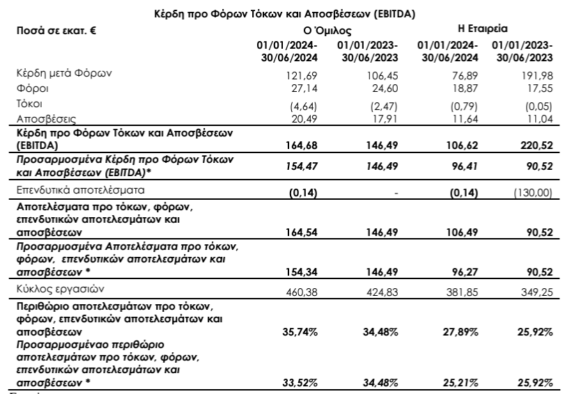 Τα κέρδη προ Φόρων, Τόκων και Αποσβέσεων (EBITDA) του Ομίλου ανήλθαν σε EUR 164,68 εκατ.€ (από 146,49 εκατ.€ την προηγούμενη αντίστοιχη περίοδο), παρουσιάζοντας αύξηση κατά + 12,42%.