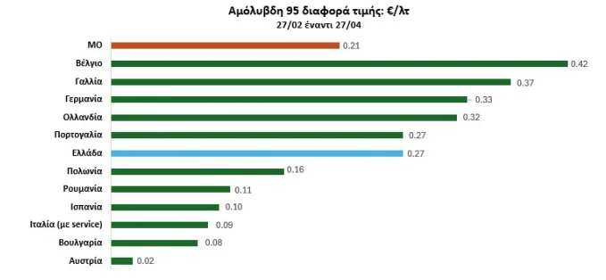 Αντίθετα, η εικόνα είναι διαφορετική στην αμόλυβδη 95 οκτανίων, όπου η Ελλάδα παρουσίασε μεγαλύτερη αύξηση από τον ευρωπαϊκό μέσο όρο. Συγκεκριμένα, η τιμή αυξήθηκε κατά +0,27 ευρώ/λίτρο, έναντι μέσης αύξησης +0,21 ευρώ στις υπό εξέταση χώρες.