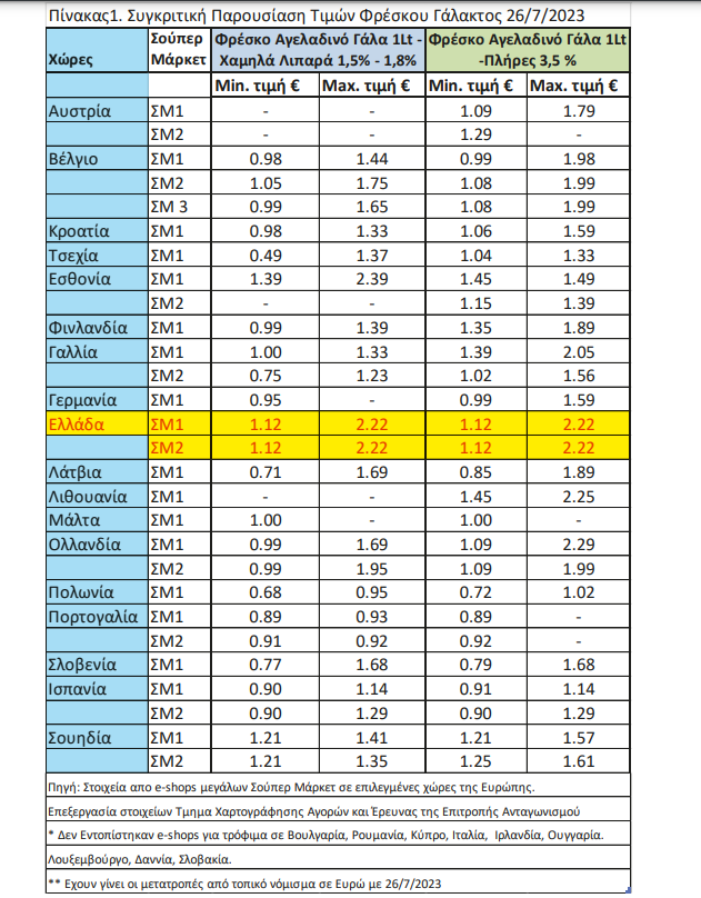Από τα στοιχεία προκύπτει ότι για την κατηγορία φρέσκο αγελαδινό γάλα με χαμηλά λιπαρά το εύρος τιμών διαμορφώθηκε, στις 26/7/2023, σε 0,49 ευρώ η χαμηλότερη και σε 2,39 ευρώ η υψηλότερη, ενώ για την κατηγορία φρέσκο αγελαδινό πλήρες γάλα το εύρος τιμών διαμορφώθηκε, σε 0,85 ευρώ η χαμηλότερη και σε 2,29 ευρώ η υψηλότερη.