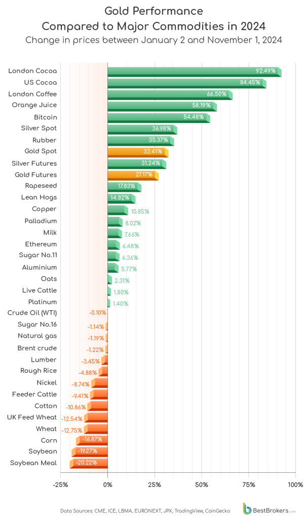 Σύμφωνα με έρευνα που εκπόνησε η BestBrokers, ελέγχοντας την τιμή spot του χρυσού και των συμβάσεων μελλοντικής εκπλήρωσης χρυσού στις αρχές του 2024 και την 1η Νοεμβρίου, με στόχο τον υπολογισμό του ρυθμού ανάπτυξής σε βάθος 10μήνου, προκύπτει ότι τα συμβόλαια αυξήθηκαν σε αξία κατά 27,17%, ενώ η τιμή spot αυξήθηκε κατά 32,41%. Οι τιμές των προθεσμιακών συμβολαίων κακάο και καφέ, ωστόσο, αυξήθηκαν πολύ περισσότερο τον περασμένο χρόνο στο Λονδίνο, σημειώνοντας αυξήσεις της τάξης του 92,49% – από τις 3.050 λίρες στις 5.871 λίρες ανά μετρικό τόνο – και 66,50% αντίστοιχα. Στην περίπτωση του αμερικανικού κακάο, τα συμβόλαια μελλοντικής εκπλήρωσης με ημερομηνία παράδοσης τον Δεκέμβριο του 2024 αυξάνονται από 3.980 $ σε 7.341 $, σημειώνοντας αύξηση 84,45%.