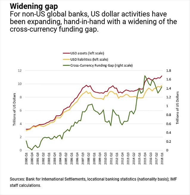 Σύμφωνα με στοιχεία που έχει συγκεντρώσει το στοιχείο, το αμερικανικό ενεργητικό μη αμερικανικών τραπεζών σε δολάρια έχει σκαρφαλώσει από τα 9,7 τρισ. δολάρια το 2012 σε 12,4 τρισ .δολάρια στα μέσα του 2018, ενώ ως ποσοστό του συνολικού τους ενεργητικού παραμένει παρόμοιο με τα προ κρίσεως επίπεδα. Παρά τη σειρά που μεταρρυθμίσεων και τους πιο αυστηρούς κανόνες κεφαλαιακής επάρκειας και ρευστότητας, που επιβλήθηκαν τα προηγούμενα χρόνια, παραμένουν το ίδιο ευάλωτες σε μία έλλειψη δολαρίων. Και αυτή με τη σειρά της θα μπορούσε να σημάνει ισχυρά σοκ όχι μόνο για τις ίδιες, αλλά και για τις οικονομίες στις οποίες δραστηριοποιούνται ή τις κυβερνήσεις, που δανείζονται από αυτές.