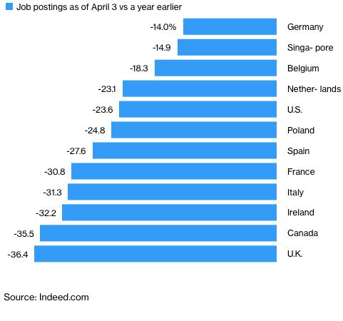 Όπως μεταδίδει το Bloomberg, όσοι αναζητούν εργασία στο Ηνωμένο Βασίλειο και τον Καναδά έχουν δεχτεί το μεγαλύτερο χτύπημα μέχρι στιγμής, καθώς οι εργοδότες διακόπτουν την επιχειρηματική δραστηριότητα τους εν μέσω lockdown και μέτρων για τον περιορισμό της εξάπλωσης του κορονοϊού.